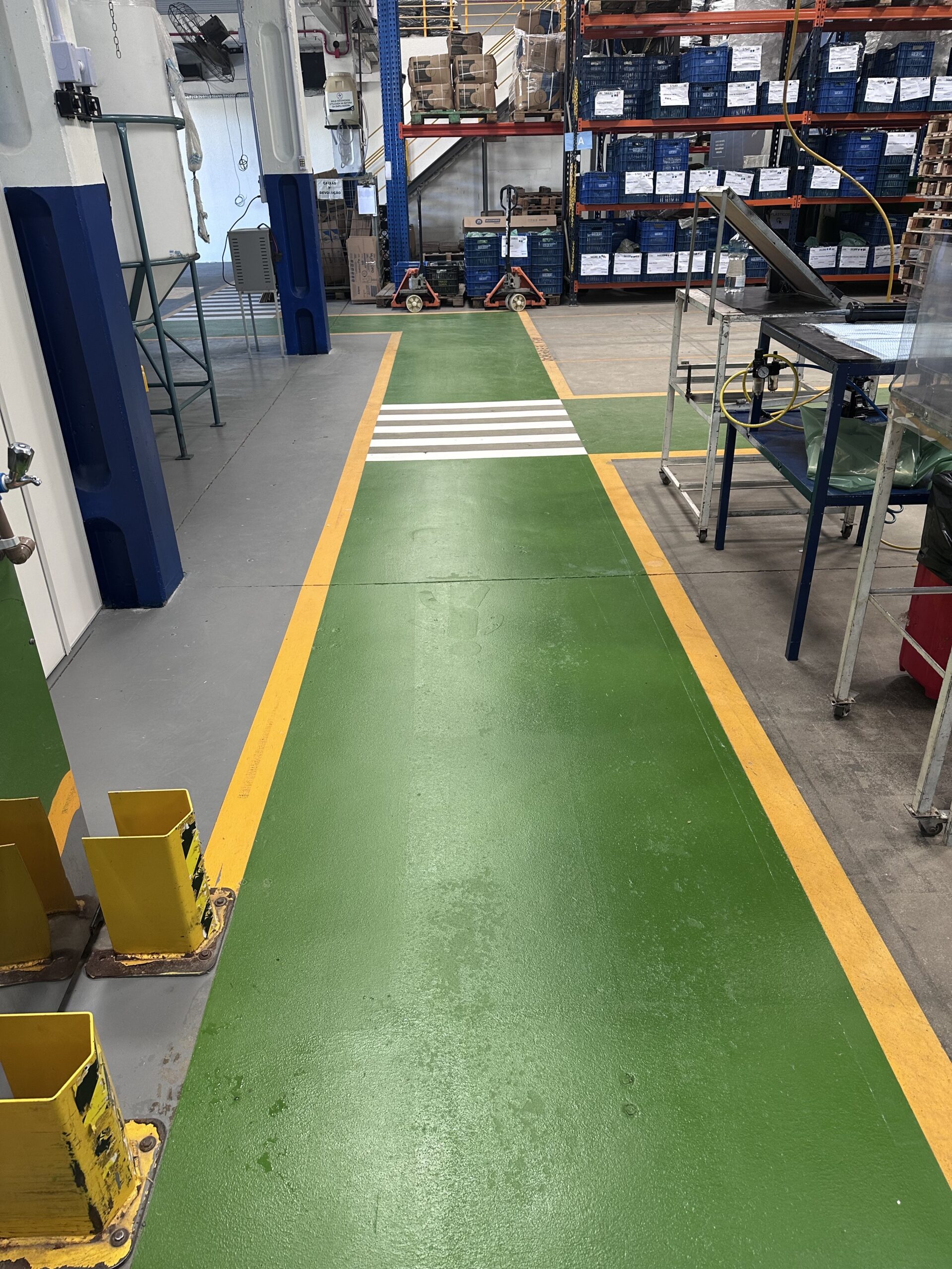 Mas o que realmente impressiona ao entrar no galpão da Goedert é o piso pintado para circulação de pessoas. É uma “estrada da segurança” que organiza o fluxo, separa pedestres de máquinas e demonstra uma clareza visual rara em ambientes industriais. Quando o chão de fábrica fala a língua da organização, o erro humano diminui drasticamente.