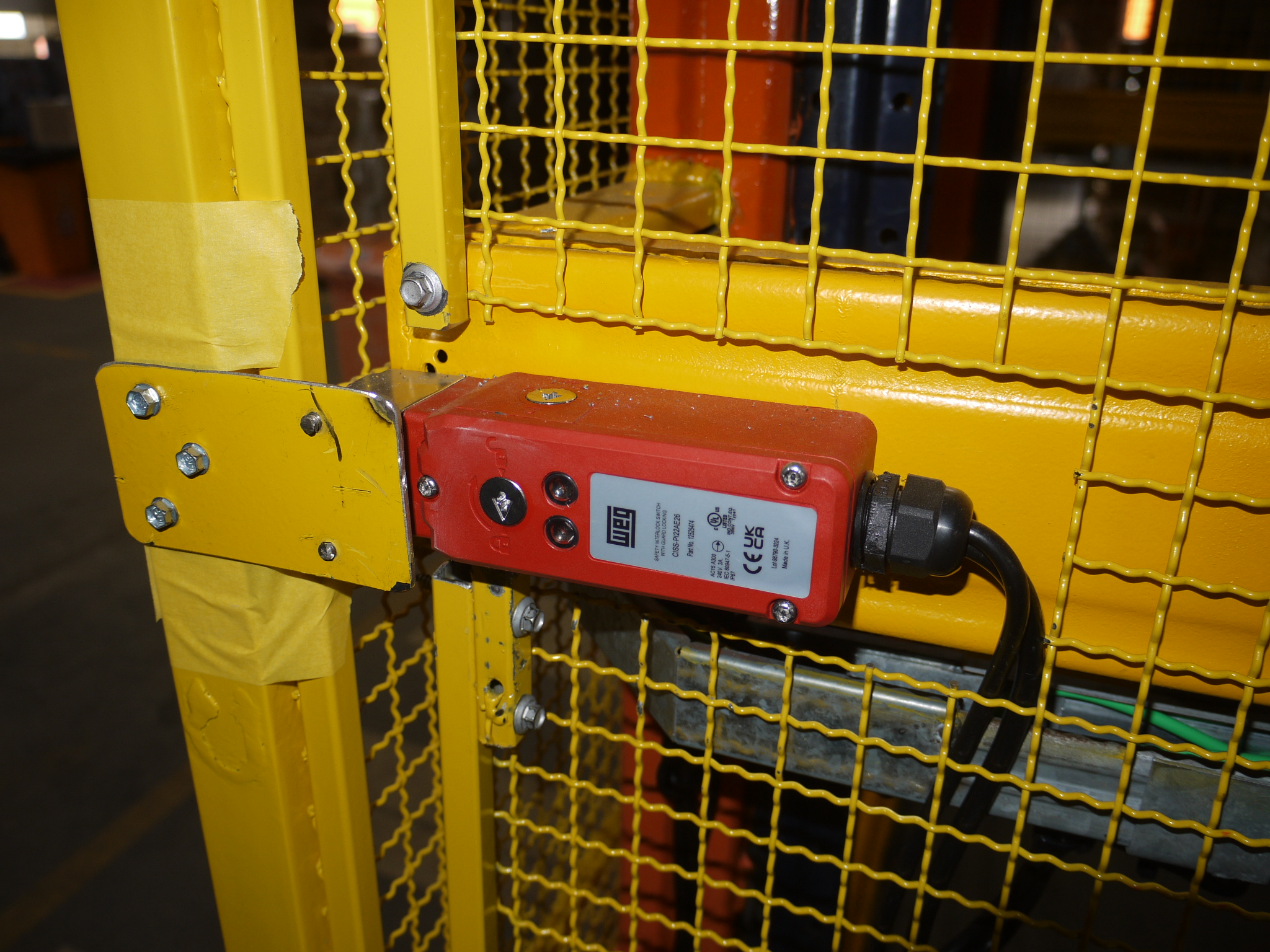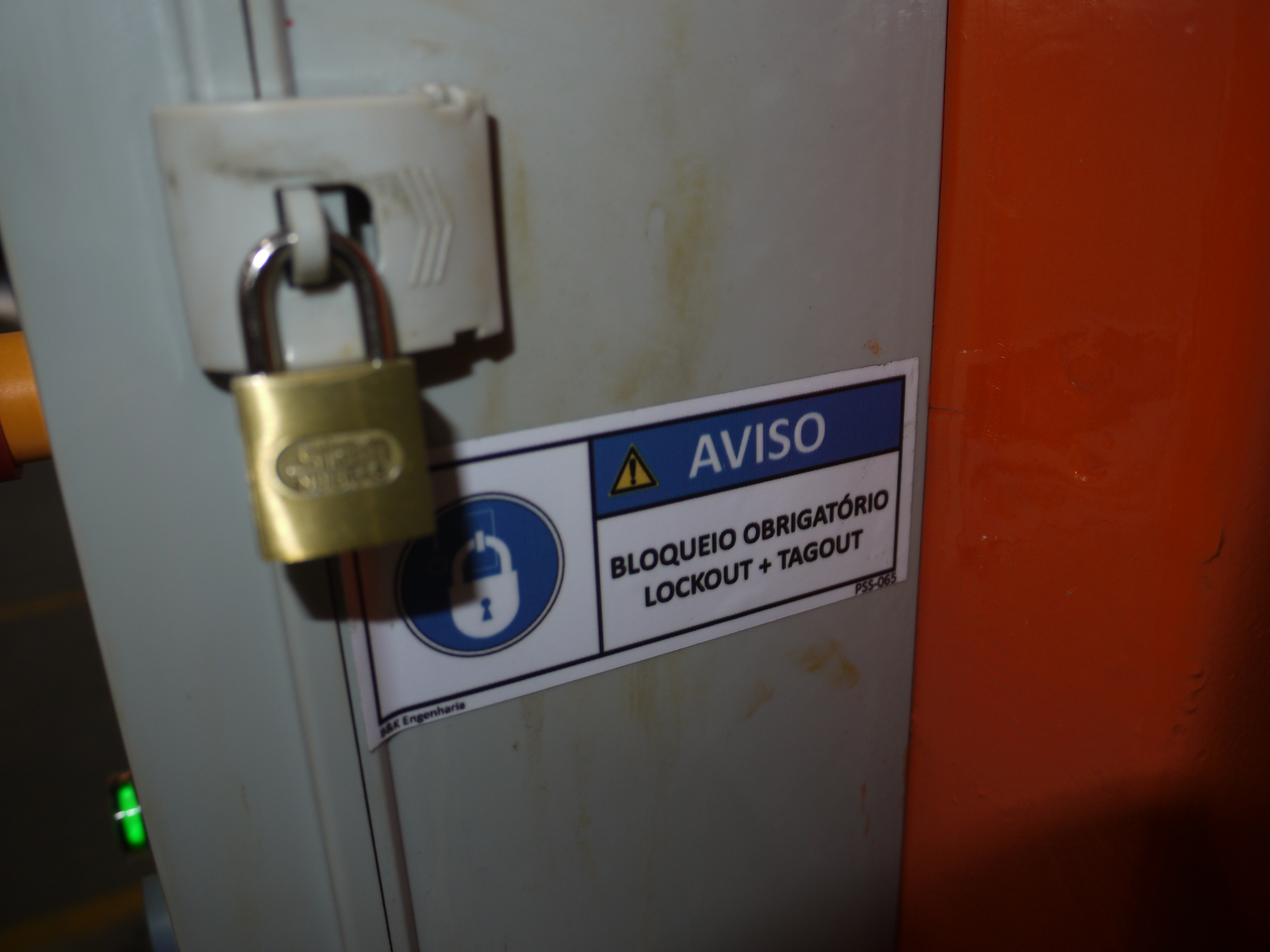 Para garantir que o elevador de carga operasse sem falhas, implementamos dispositivos de última geração. O destaque vai para as chaves eletromecânicas de segurança intertravadas instaladas nos portões de cada piso de acesso.